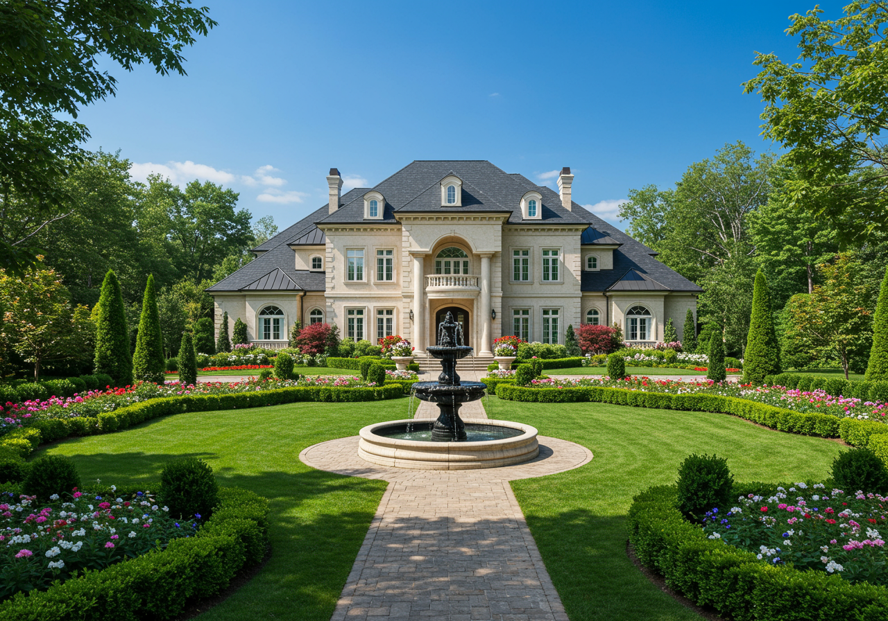 The grounds on this .55-acre lot offer a front courtyard with a fountain and a backyard with a patio, lawn, and additional water features.